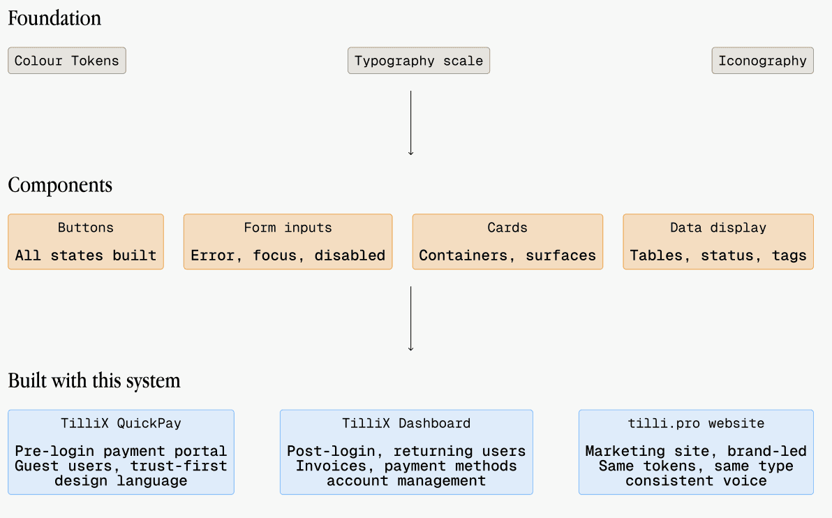 The system was built to outlast TilliX. Tokens, type scale, and components are structured so any future Tilli product can inherit the foundation without starting over.