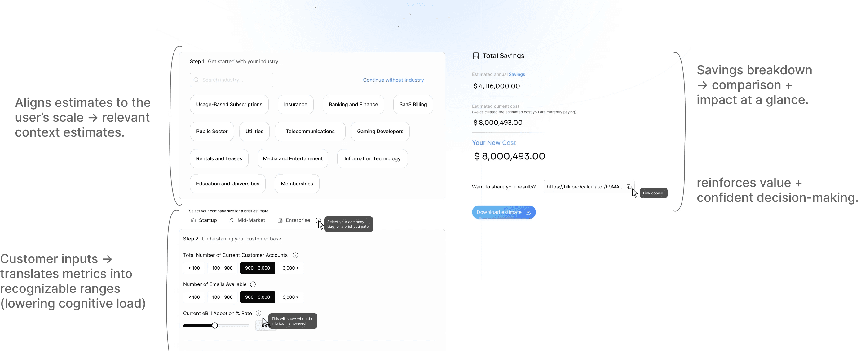 So I designed an interactive savings calculator that turns Tilli’s value into clear, measurable outcomes. Inspired by SaaS estimators users can self-validate ROI.